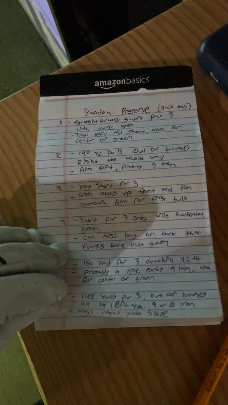 To prepare for this trip, I've played every available Bandon course on the simulator, some multiple times. I'm trying to be more mindful when doing this so I'm taking manual notes like a caddy. I don't think this will actually help me out but it's kinda funny and a good memory to keep.